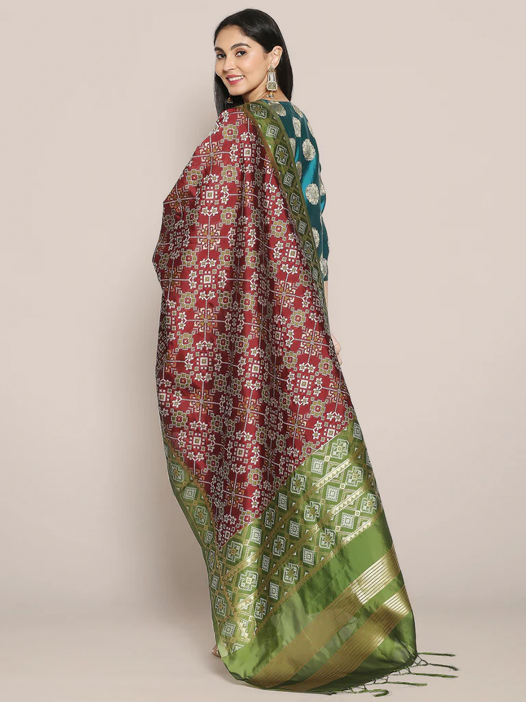 This ageless woven Patola Banarasi silk dupatta is crafted by local artisans and its graceful appeal makes it perfect for wedding wear as much as it does for an avid dupatta lover.